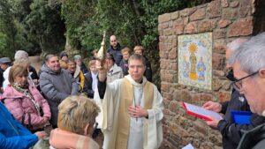 Una cinquantena de fidels de la parròquia de Santa Maria de Guissona es van aplegar diumenge 18 de gener al Monestir de Montserrat per assistir a la benedicció de la Majòlica de la Mare de Déu del Claustre de Guissona, instal·lada al camí dels Degotalls.