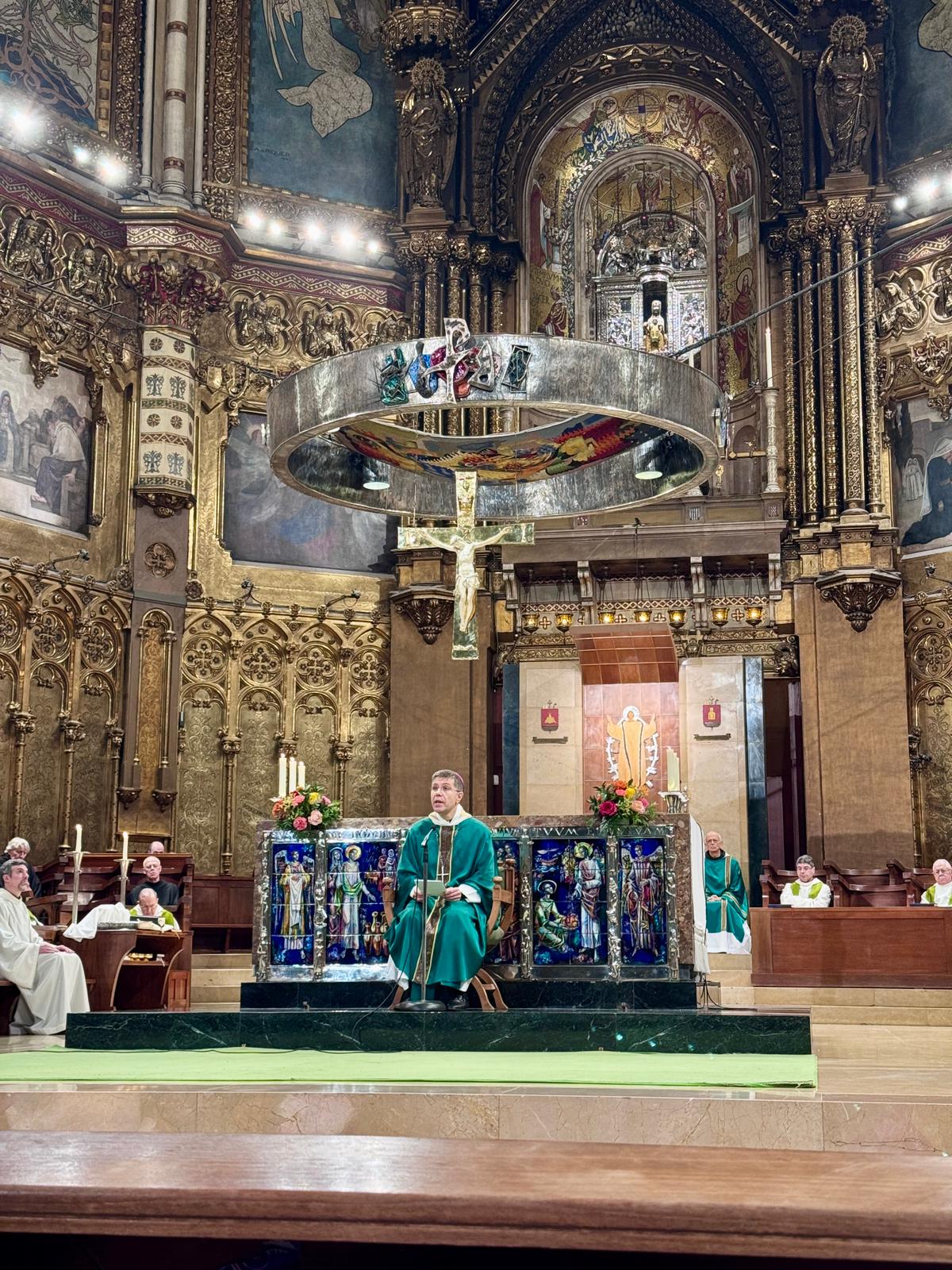 El grup va participar, amb la resta de pelegrins de Montserrat, a la missa conventual presidida pel Senyor bisbe d’Urgell, Mons. Josep-Lluís Serrano, concelebrada pels monjos de la comunitat benedictina i pel rector de Guissona, Mn. Ramon Balagué. A l’homilia, Mons. Serrano va glossar les lectures tot parlant del servent, de la crida que Déu fa, de la vocació i de l’escolta; remarcà de l’evangeli que “ens presenta Joan Baptista assenyalant Jesús amb una frase senzilla i, alhora, inesgotable: «Aquest és l’Anyell de Déu»”. Joan no es queda en si mateix. No reté. No s’apropia. Fa el que fa tot veritable servidor de Déu: apuntar cap a un Altre. La missió de Joan és indicar. La missió de Joan és indicar. La missió del deixeble és servir” “La vida monàstica, en el fons, és un gran gest de Joan Baptista: una existència que, sense fer soroll, diu amb tota la seva forma: «Mireu el Senyor». I ho diu no amb discursos, sinó amb la fidelitat quotidiana: amb la litúrgia celebrada amb el cor, amb l’escolta de la Paraula, amb la caritat fraterna, amb l’estabilitat en el lloc i en la vocació”.