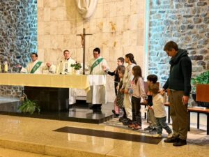 A continuació es va celebrar l’Eucaristia a l’església de la Sagrada Família, presidida pel bisbe d’Urgell, Mons. Josep-Lluís Serrano, amb el servei dels diaques Mn. Edinson-Josep Salas i Mn. Gilbert Bea, i acolitant els seminaristes Carlos Rosas i Mateo Arias. Durant la seva homilia, el bisbe va recordar la Beata Anna Maria Janer, verge i fundadora de l’Institut de Germanes de la Sagrada Família d’Urgell, destacant la seva vida entregada al servei dels altres, la seva estima per tots els infants i la dedicació constant a l’educació i la caritat. Va alabar les seves virtuts de misericòrdia, passió i reconeixement de la dignitat de cada persona, i va convidar a pregar per les germanes de l’institut, per la vida consagrada, per les vocacions i perquè a les escoles també hi puguin néixer noves vocacions de servei als altres, recordant que “així mirava la Beata Anna Maria Janer: amb estima. La seva mirada no jutjava ni posseïa, sinó que reconeixia la dignitat de cada persona i l’acompanyava. Quan es mira així, amb misericòrdia i passió, la vida floreix, els infants creixen i la felicitat neix d’una mirada que s’assembla a la de Déu.”