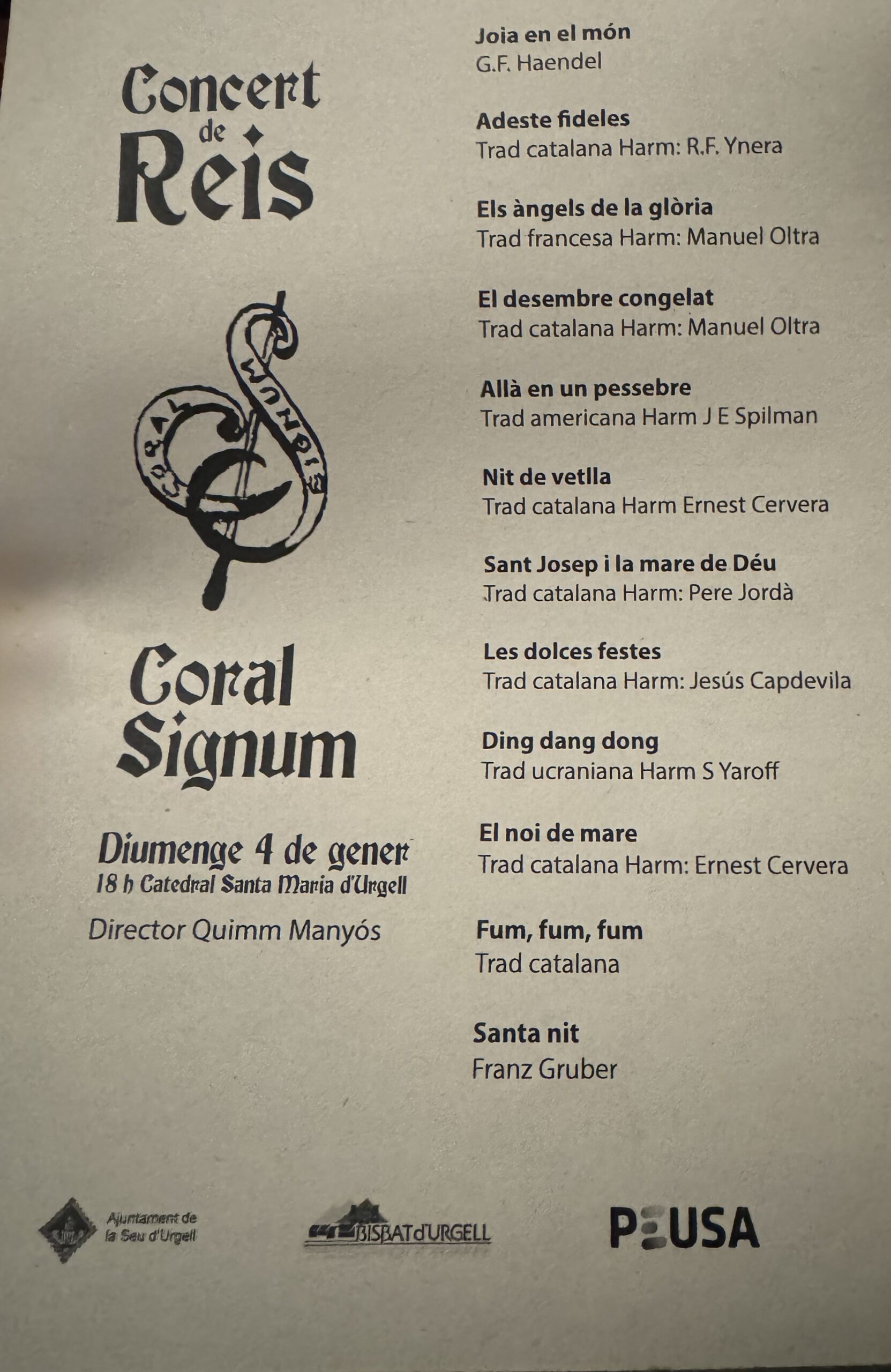 El concierto contó con la presencia del Obispo de Urgell, Mons. Josep-Lluís Serrano; del Alcalde de la ciudad de La Seu d’Urgell, Ilmo. Sr. Joan Barrera; del Vicario General y Rector de la Parroquia de St. Ot, Mn. Ignasi Navarri; así como de numerosos fieles que llenaron el templo románico, que fue el marco ideal para el canto de la coral Signum bajo la dirección del Sr. Quim Manyós.